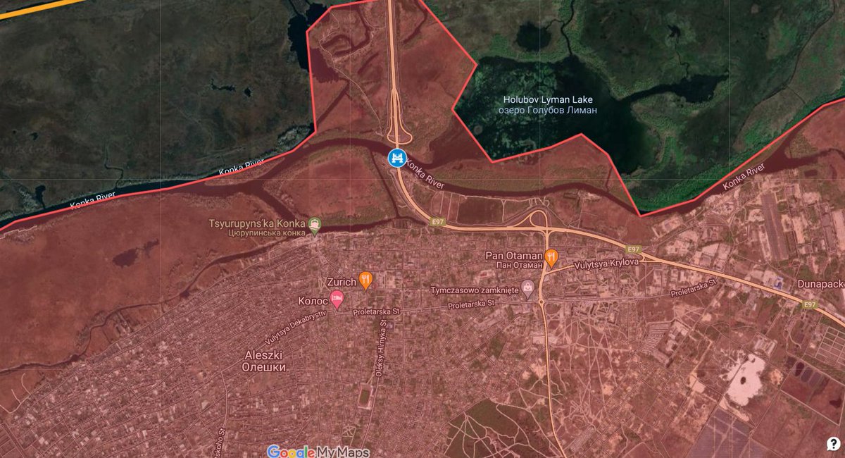 W mojej ocenie siła uderzenia UA w pierwszych 48 godzinach w tym miejscu była za mała, aby mówić o szansach na szybkie zajęcie mostu nad rzeką Konka, a następnie miejscowości Aleszki. Dopiero jej opanowanie pozwoliłoby pomyśleć o ofensywie w tym regionie. Obecnie będzie cieżko.3/