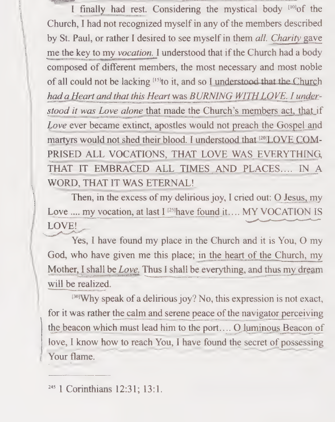 And the height and depth of the Cross, the great profundity of God’s love. / within the life and teachings of St. Thérèse of the Child Jesus, whose vocation is love (A Story of a Soul, § 9).