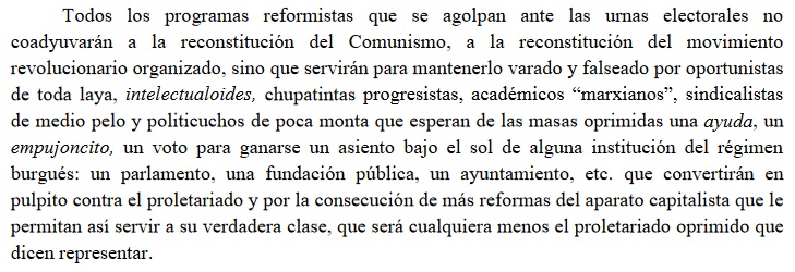 Todo lo que en el MC se plantea y se organiza fuera del Plan de Reconstitución y sus tareas condena al proletariado a seguir siendo espectador impotente de las demás clases que, en su “representación”, aspiran a gestionar “democráticamente” su explotación y miseria;