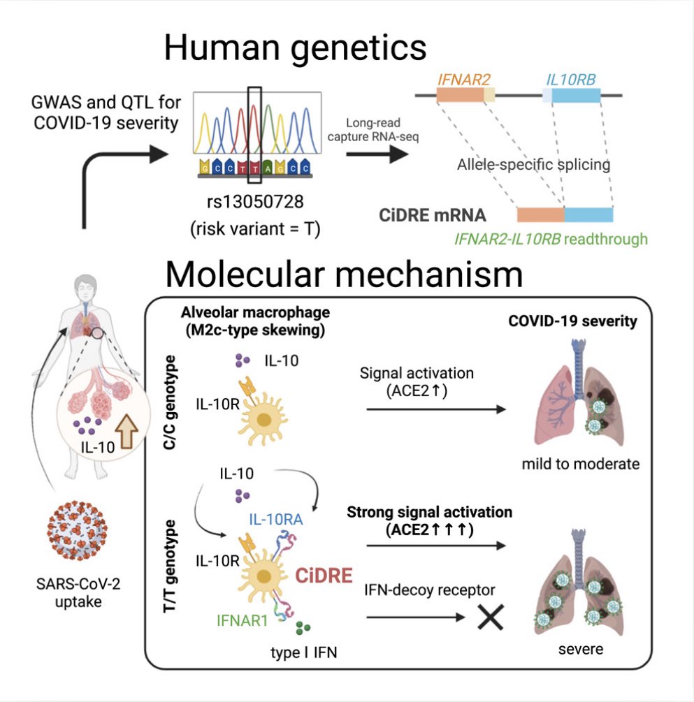 They identified a IFNAR2-IL10RB readthrough transcript, COVID-19 infectivity-enhancing dual receptor (CiDRE), which was highly expressed in patients w/ COVID risk variants at IFNAR2 locus 2/