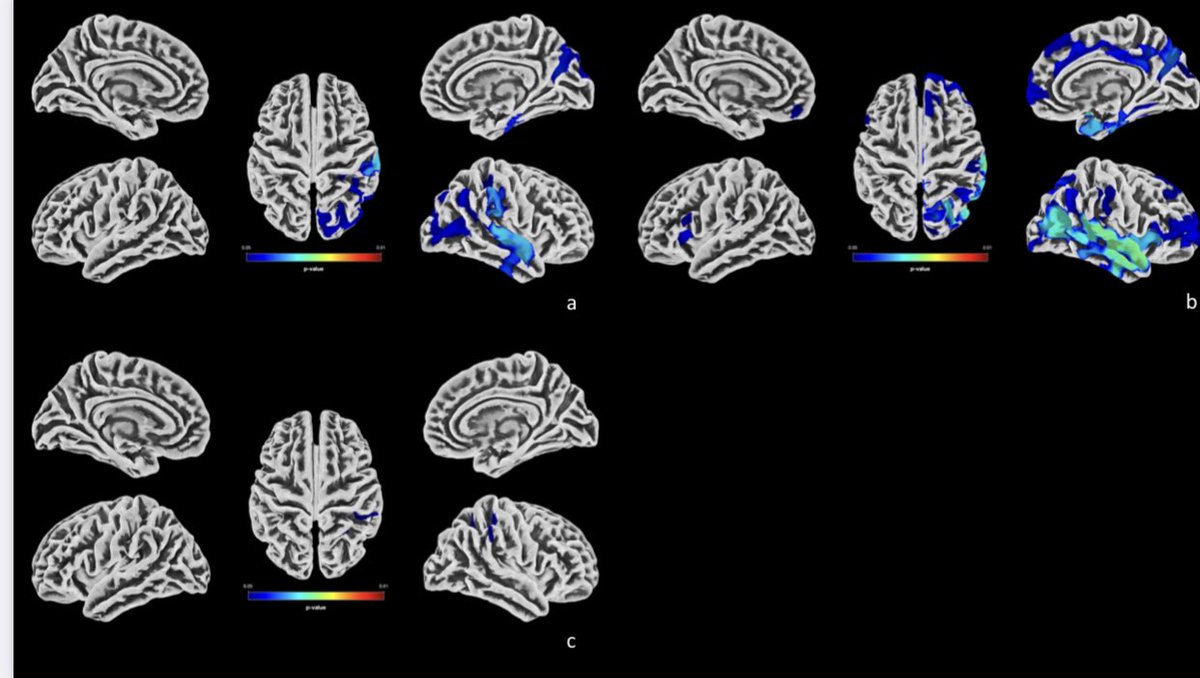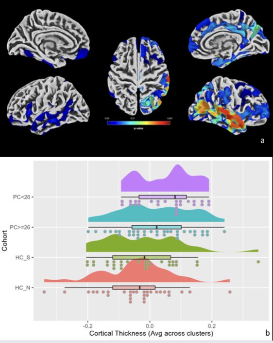 They identified distinct cortical areas w/ a progressive increase in thickness across diff groups, starting from healthy who had never been infected w/ COVID, followed by healthy COVID survivors, long-COVID patients w/out cognitive deficits & long-COVID w/ cognitive deficits. 3/