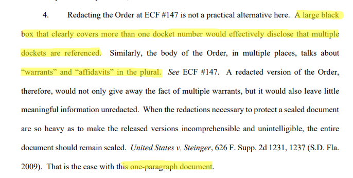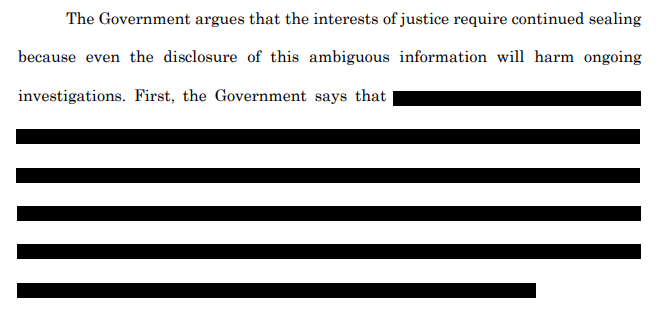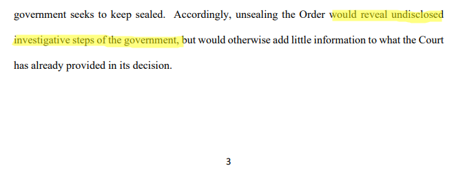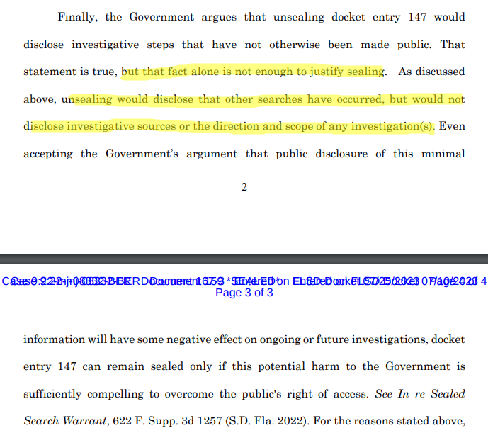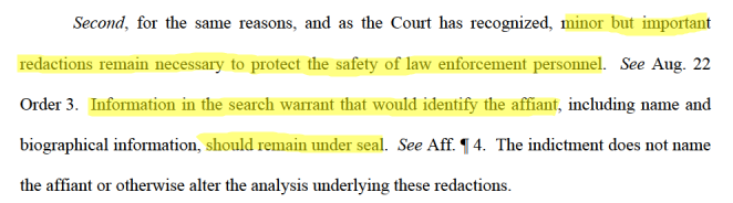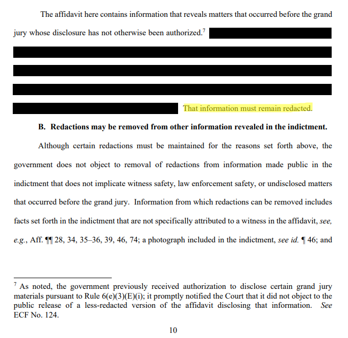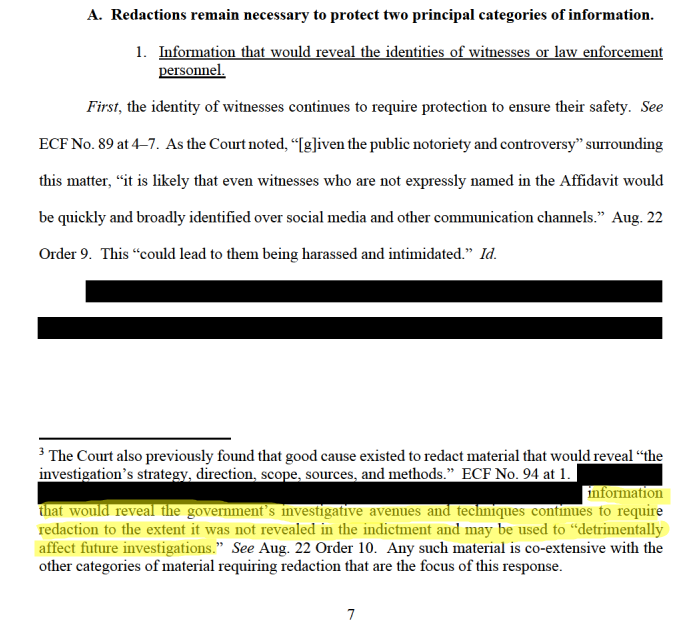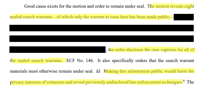 "Compelling governmental interests continue to require the sealing of the remainder of the affidavit, however. As an initial matter, the affidavit contains information that was not made public in the indictment because it would tend to reveal the identities of witnesses, law… https://t.co/0aojR3wOsvtwitter.com/i/web/status/1…