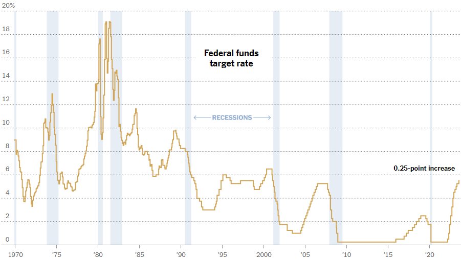 The Fed just raised interest rates again, by 0.25% to a 22-year high (the 11th increase since March 2022).