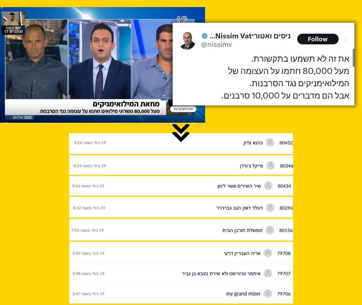 1) נתחיל מפייק שהצליח באופן חריג, חצה את תיבת התהודה של תומכי נתניהו והפך לכותרת בולטת בחדשות 12. אם גם אתם נחשפתם לסיפור על עשרות אלפי מילואימניקים שחתמו על עצומה שמתנגדת לסרבנות - קחו רגע כדי להביט ברשימת החותמים.