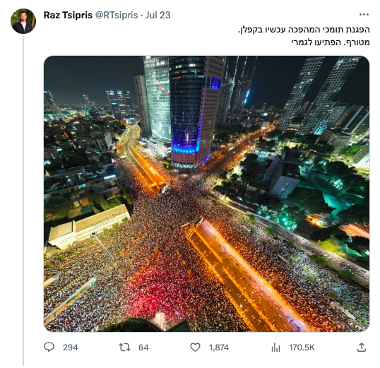 4) כבר באותו ערב פייק נוסף נולד. בדיחה של @RTsipris יצאה משליטה אחרי שפרסם תמונה של הפגנת המחאה בקפלן ממוצ״ש וכתב שמדובר בהפגנת הימין. ההומור לא הובן ובמהרה ינון מגל, יעל צין, איתמר בן גביר, עמיחי שיקלי ורבים נוספים פרסמו את השקר, שהפך ברשת למציאות. הבדיחה בסוף על חשבוננו.