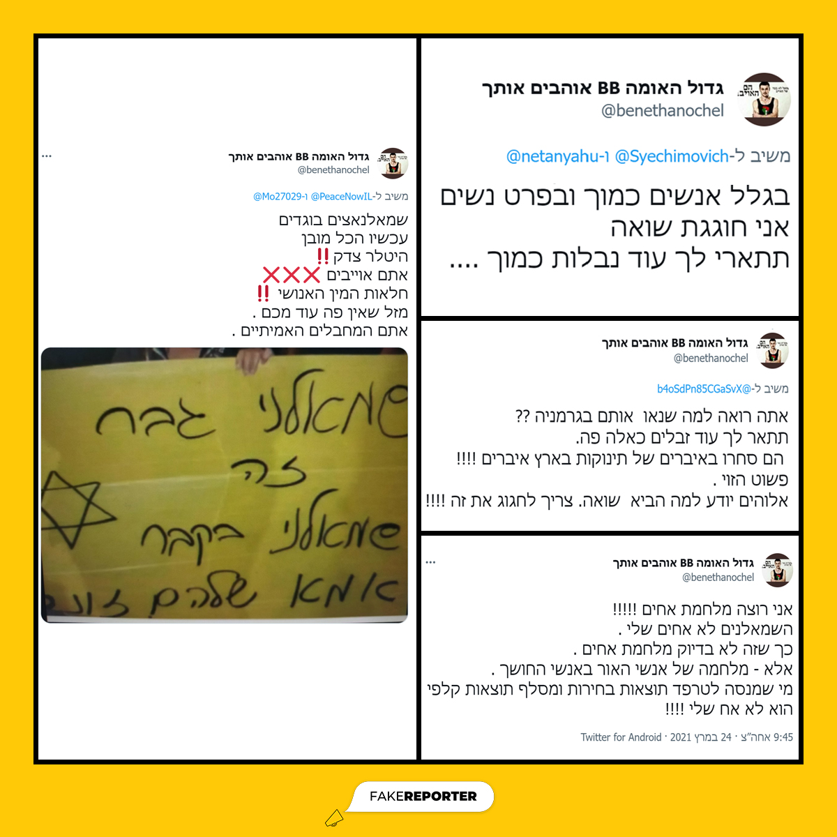 הפרופיל של המאיים הסדרתי נפתח בפברואר 2020. התוכן המפורסם מוקדש להאדרה ותמיכה בח״כ נתניהו. מי שמסומן כיריב של נתניהו והליכוד יותקף על ידי הפרופיל בציוצים רוויי שנאה, הסתה, איומים וקונספירציות.