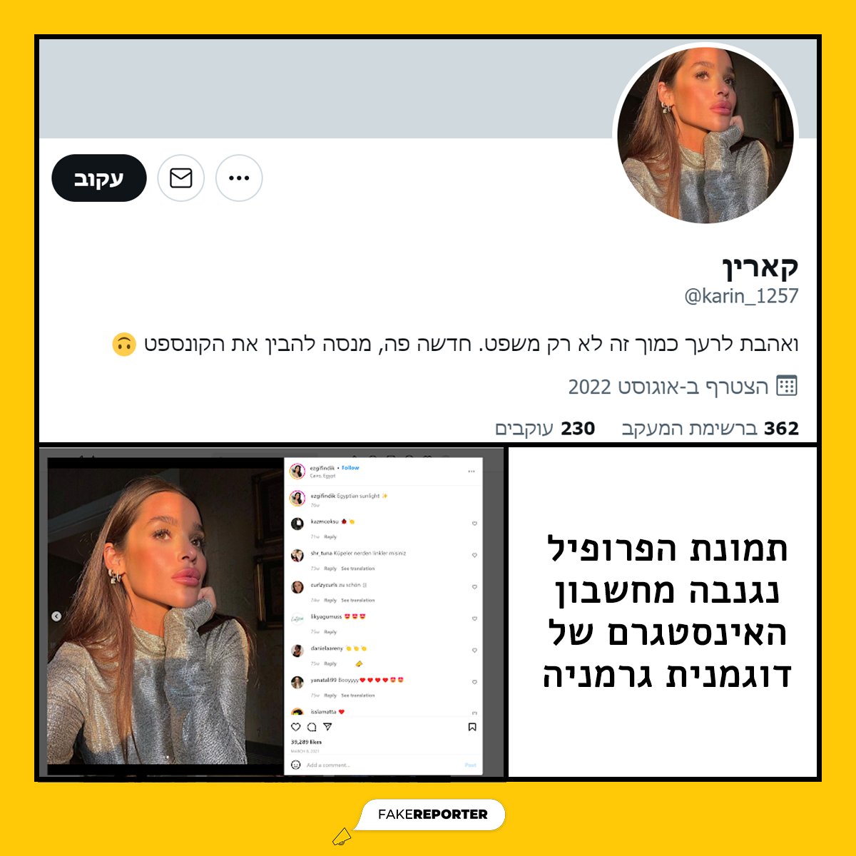 הכירו את "בת גביר" - "קארין". דוגמה לפרופיל שנפתח ב-8\17 עם תמונה גנובה של דוגמנית גרמניה. טרם האיחוד המחודש עם @bezalelsm בשישי האחרון, קארין החלה לשבח ולעודד את בן גביר להתפצל מ@zionutdatit ולרוץ לכנסת ברשימה נפרדת. והיא לא לבד.