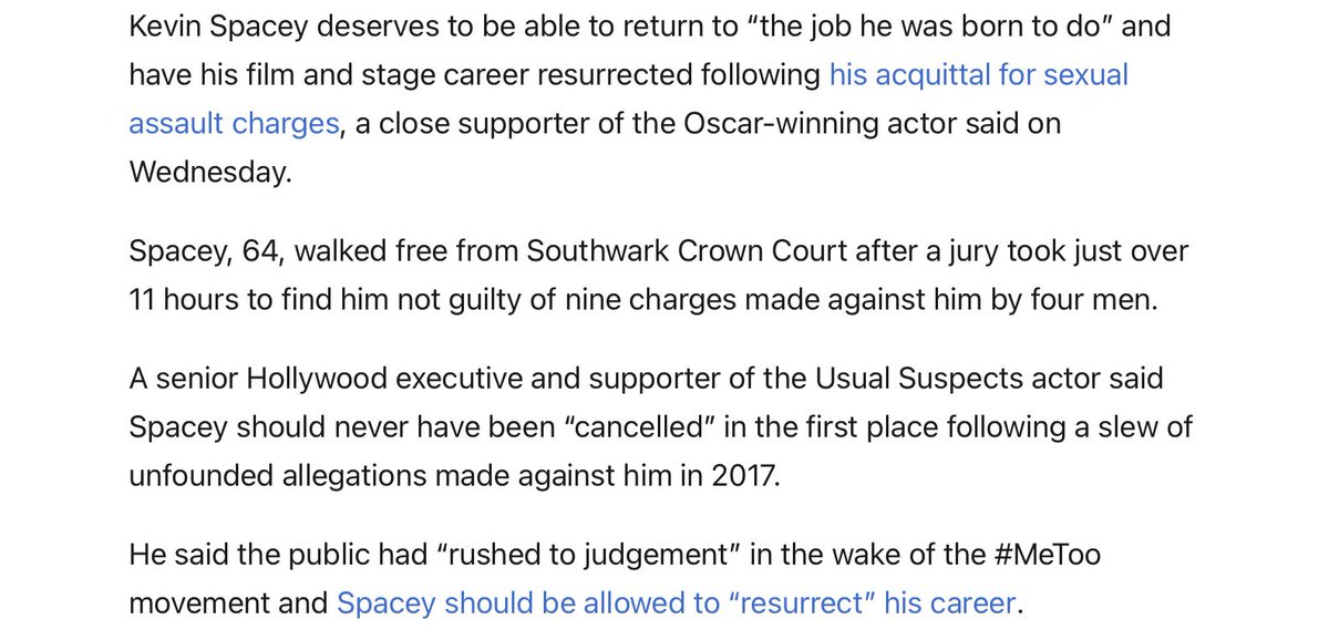 Kevin Spacey was found not guilty in this trial in the UK. I don’t know anything about the charges but I know he is a sexual predator who molested my brother. I sincerely doubt it’s in the cards but if he does get rehabilitated into hollywood, I will lose it.