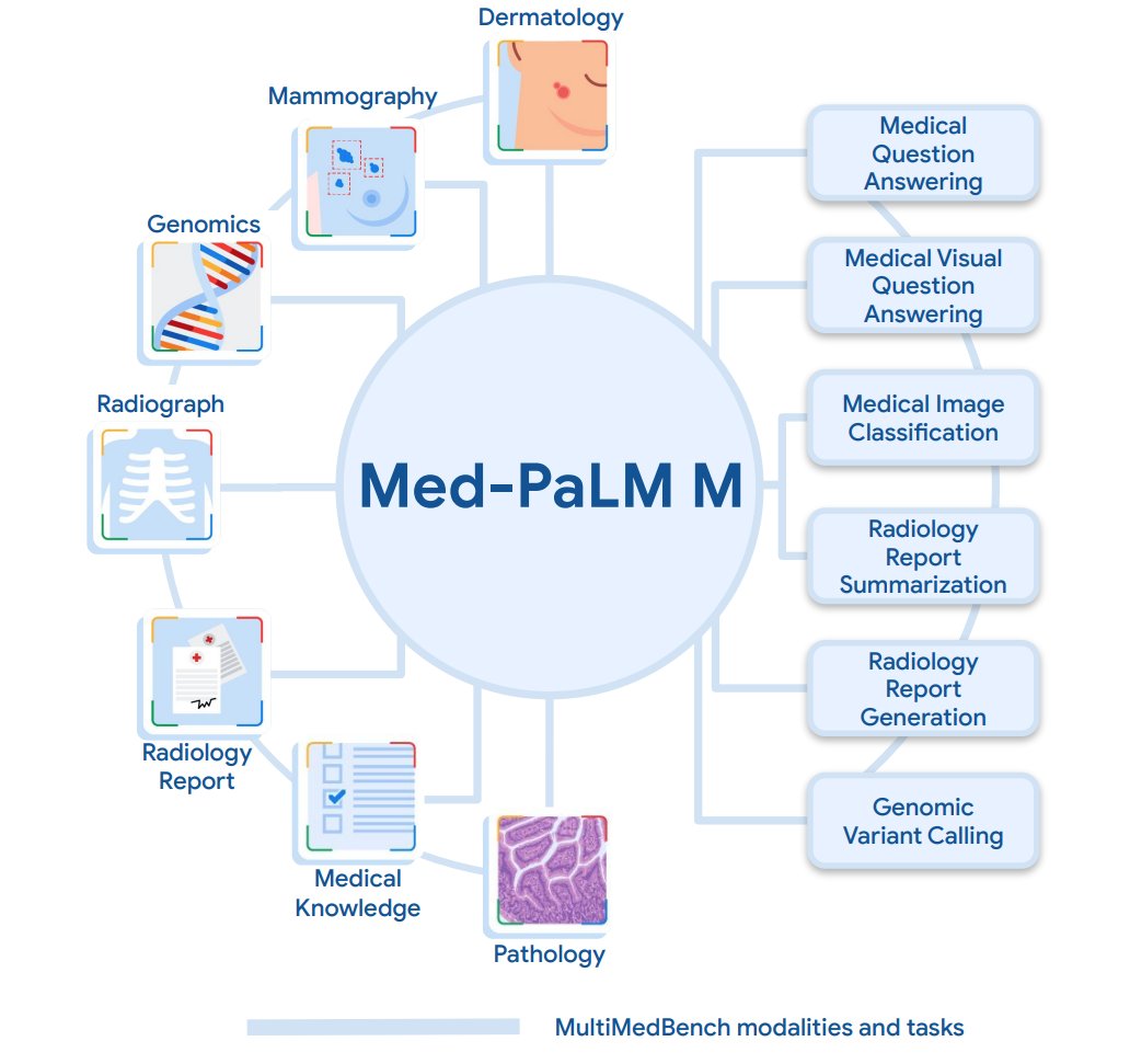 @taotu831 @AziziShekoofeh @HardyShakerman @peteflorence @DannyDriess @thekaransinghal @alan_karthi Med-PaLM M is built by fine tuning and aligning PaLM-E - an embodied multimodal language model from @GoogleAI - to the biomedical domain using MultiMedBench, a newly curated open source biomedical benchmark.