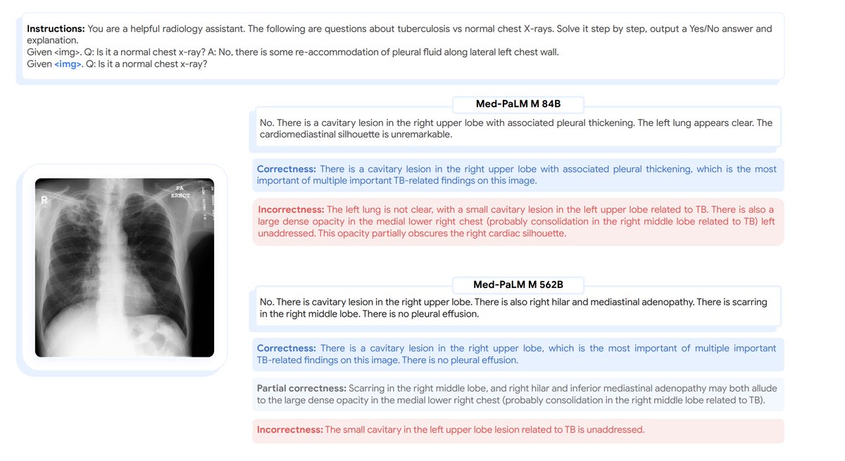 @taotu831 @AziziShekoofeh @HardyShakerman @peteflorence @DannyDriess @thekaransinghal @alan_karthi @GoogleAI For eg, we find that Med-PaLM M can accurately identify and describe TB in chest x-rays despite having never encountered presentations of the disease before in images - only through language based instructions and prompts.