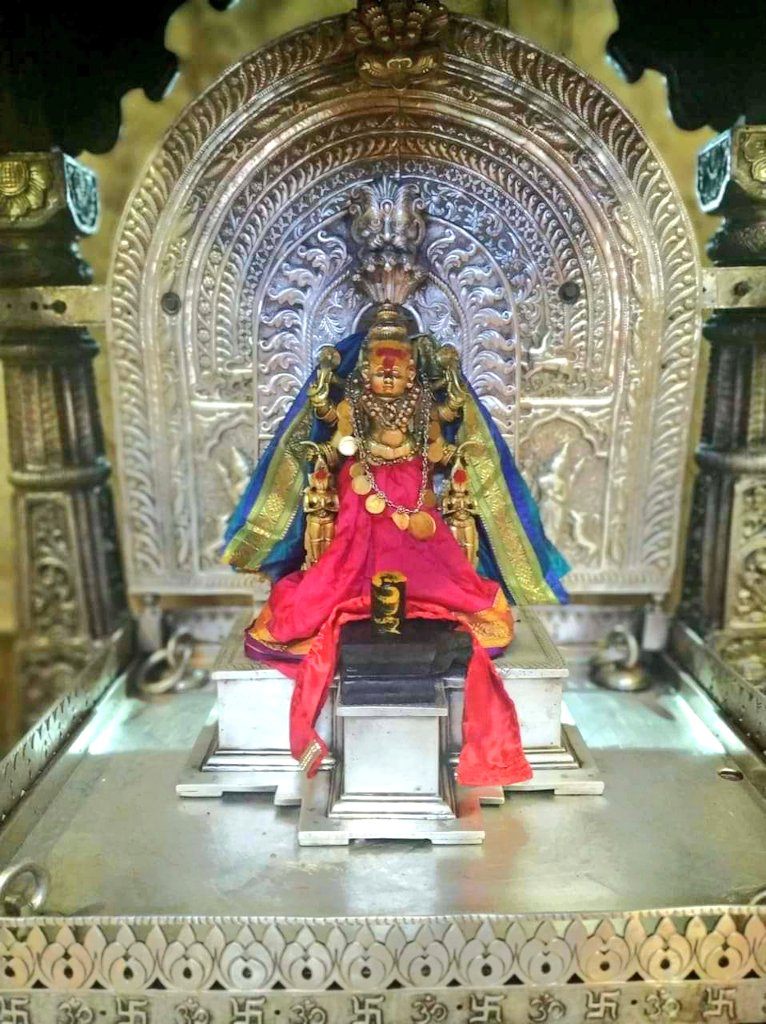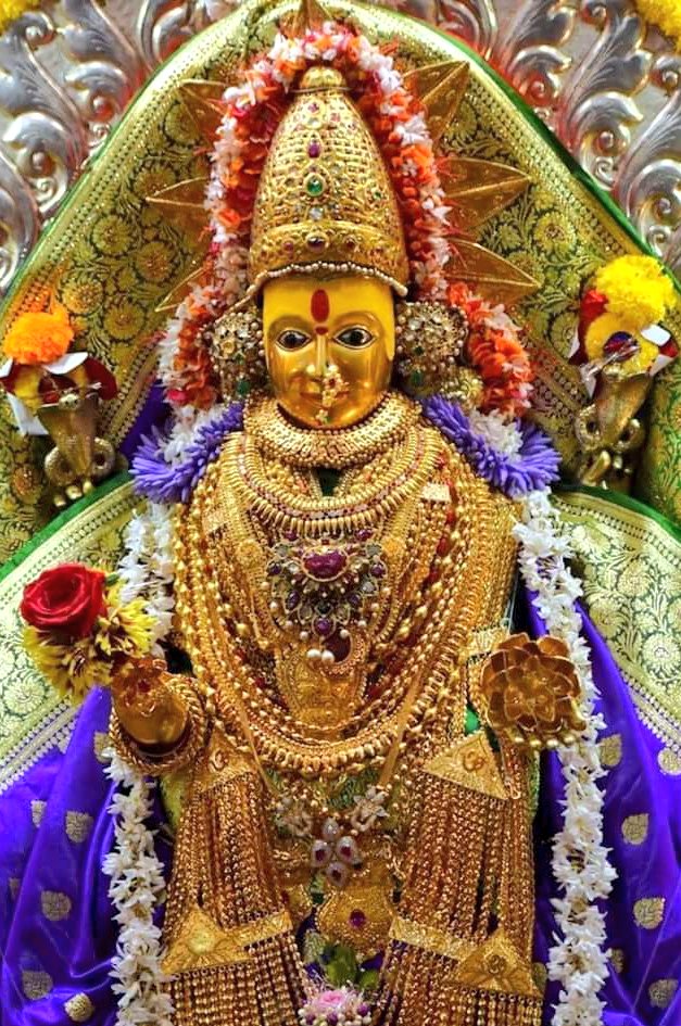 The Vigraha of Devi Vijayadurga is almost two and a half feet tall and in the form Ashtabhuja Mahishasuramardini Durga, carrying various weapons like sword, shield, chakra, conch, etc. The vigraha is incredibly lifelike and the smile on Aai's face is extremely assuring.