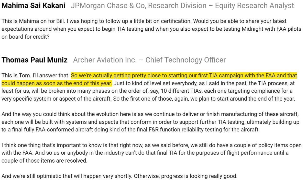 2) On $ACHR's November 6, 2025 conf. call, CTO Muniz said "our first TIA campaign with the FAA…could happen as soon as the end of this year." CEO Goldstein said "we're now nearing completion of the piloted CTOL flight regime" and that piloted VTOL testing would be next.