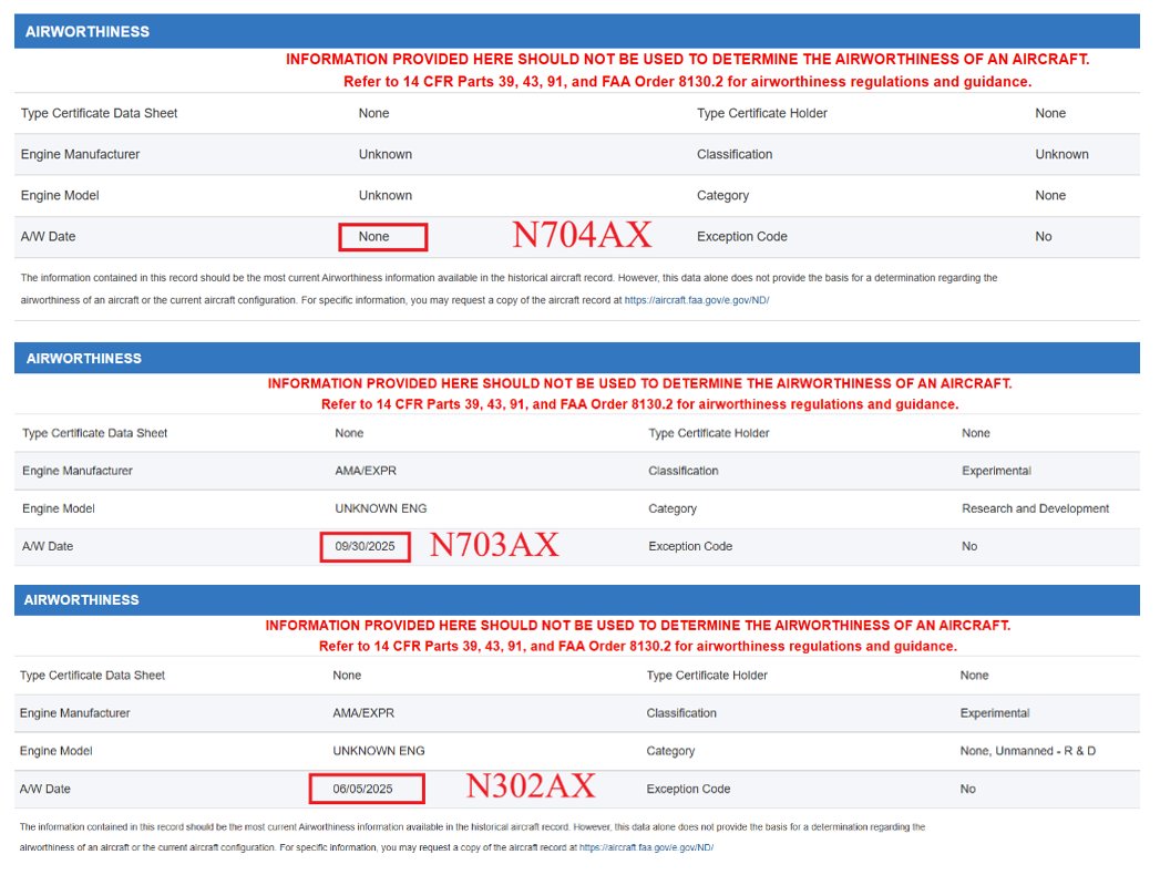 3) Yet flight logs suggest $ACHR has not engaged in a single ground or air test for the past 3 months. Further, $ACHR doesn't appear to have obtained an airworthiness certificate for N704AX - they couldn't fly it even if they wanted to.