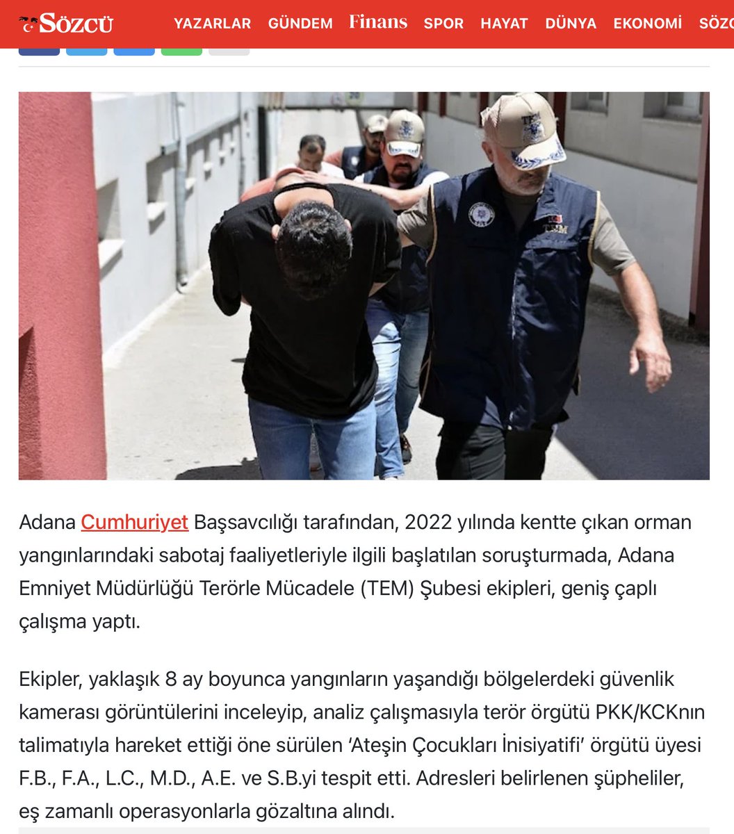 Çünkü Adana orman yangınları Pkk talimatıyla Ateşin çocukları denen terörist grup tarafıdan başlatılmıştı. Akbelen olaylarını örgütleyen bir numaraları çevre derneğinin paylaşımları arasında Pkk'nın arka arkaya çıkardığı yangınlar yok. İşte çevrecilikleri bu kadar.