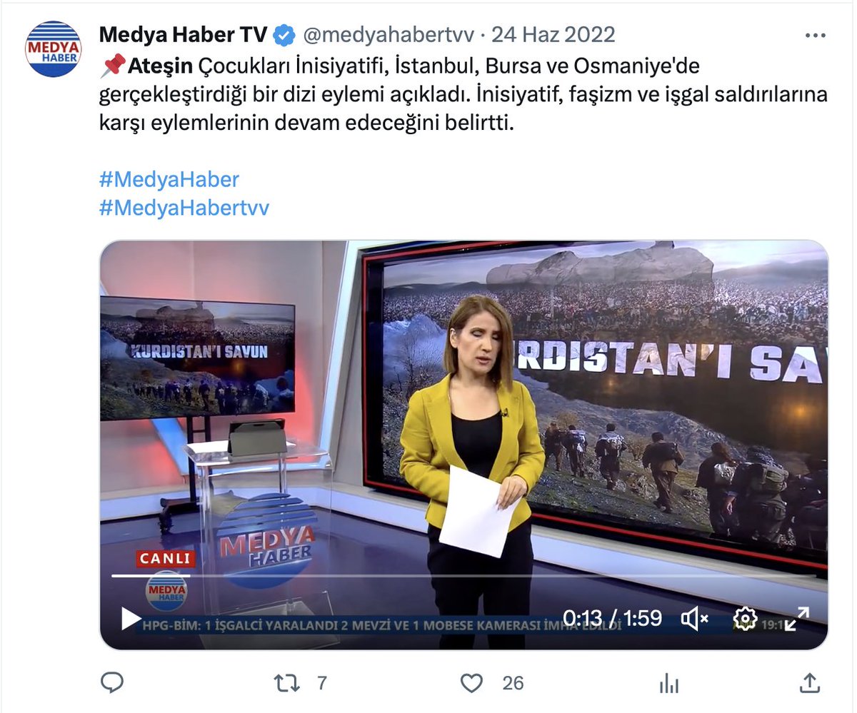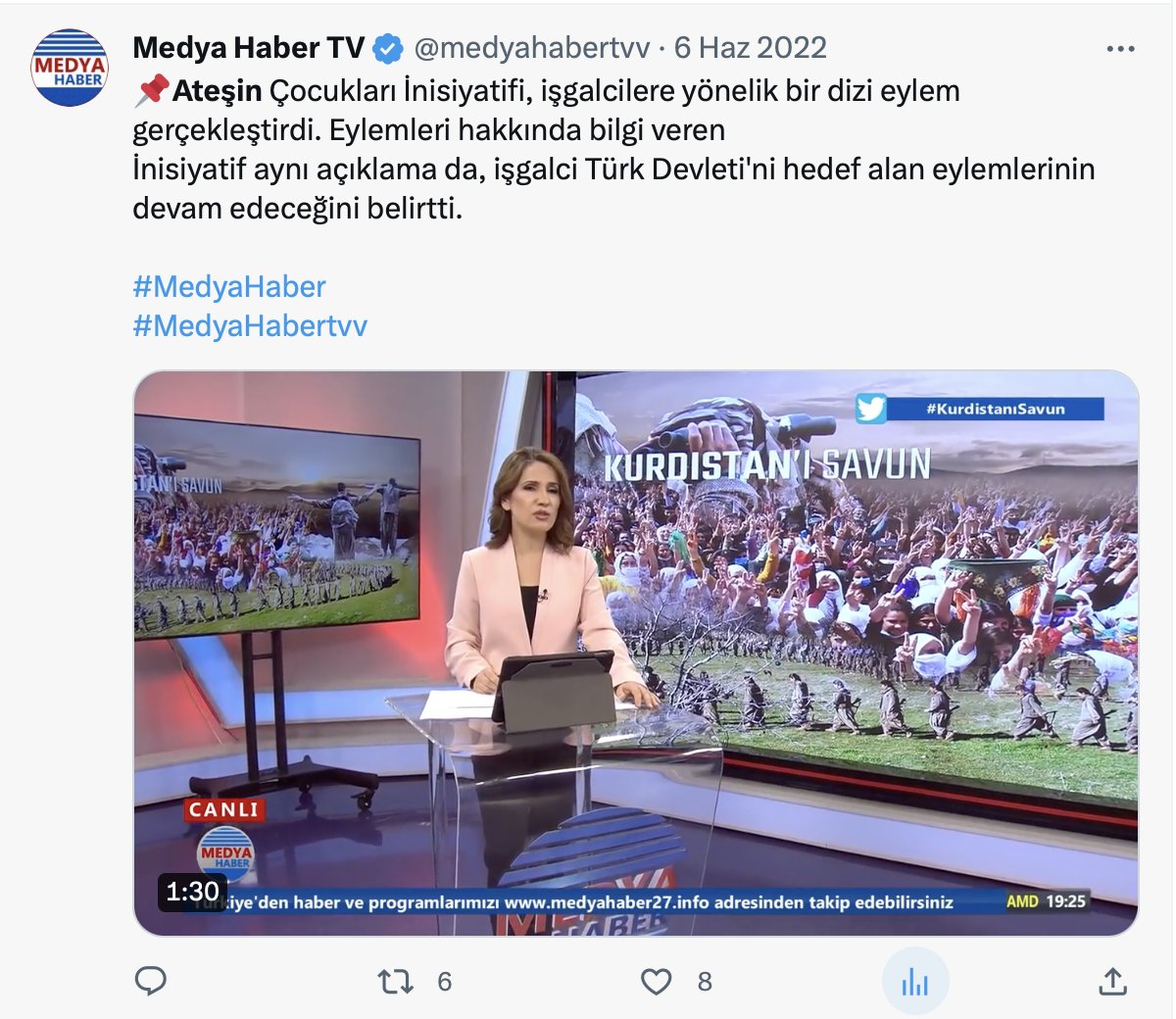 Bu terörist kanal Türkiye'de yasaklı. Şehitlerimiz hakkında " Pkk tarafından cezalandırıldı" ordumuz hakkında ise " işgal ordusu" şeklinde tabirler kullanıyor. Bütün Hdp ve Ysp vekilleri her gün burada yayınlara katılıyor ve partilileri Akbelen'e davet ediyor.