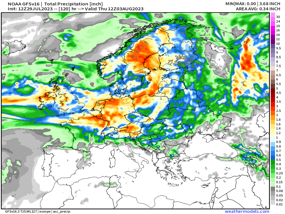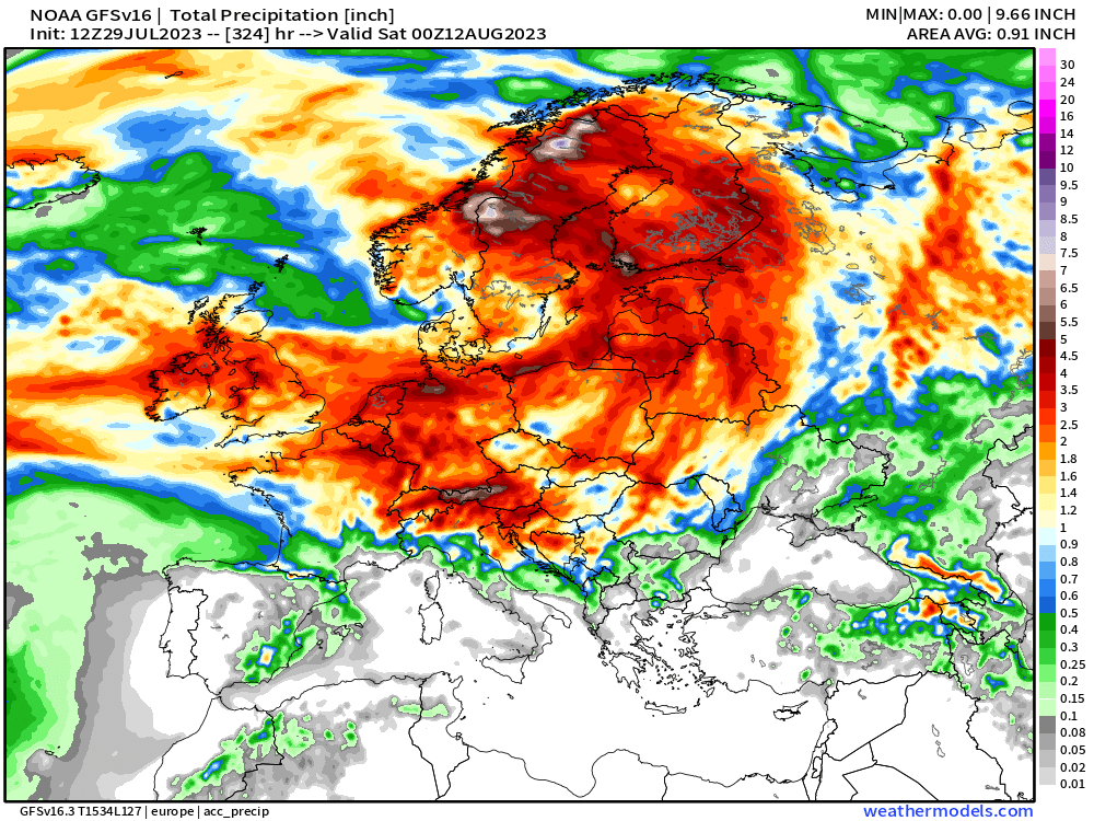 The outcome of all of this will be lots of rain over nearly all of Europe north of the Mediterranean - with light rain along the Northern Med. coastline.