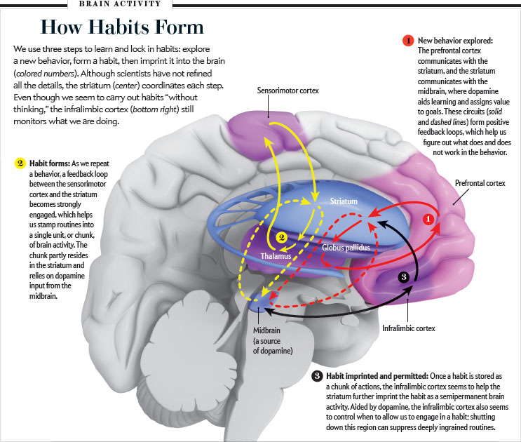 4) Stage 1. As we repeat a behavior, a feedback loop between the sensorimotor cortex and the striatum becomes strongly engaged, which helps us stamp routines into a single unit, or chunk, of brain activity. The chunk partly relies on "dopamine input" from the midbrain.