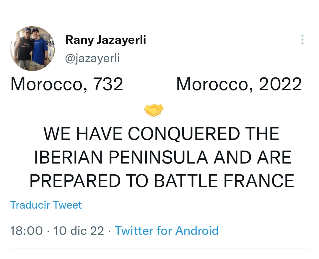 Ojo, esto no lo vimos venir. Un estadounidense musulmán hablando en primera persona del plural cuando habla de los musulmanes de la Batalla de Poitiers del 732 y de un Marruecos que no existía en esa época.