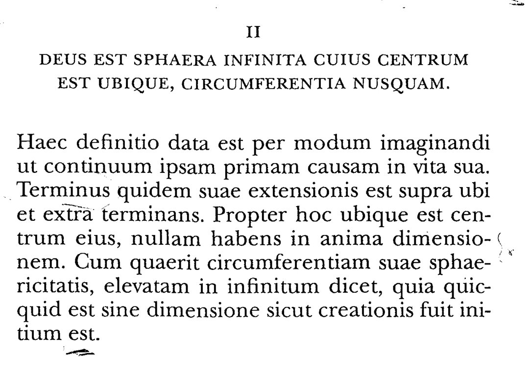GOD IS AN INFINITE SPHERE WHOSE CENTRE IS EVERYWHERE AND WHOSE CIRCUMFERENCE IS NOWHERE.