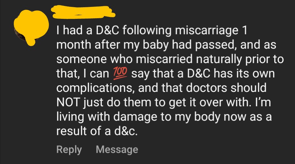 Second, D&Cs and mife/miso aren't without their own risks. Doctors may ask women to wait and see if their bodies expel the remains without intervention believing that's the safer option in given circumstances. If it doesn't work, they can still opt for D&C or pills. 5/