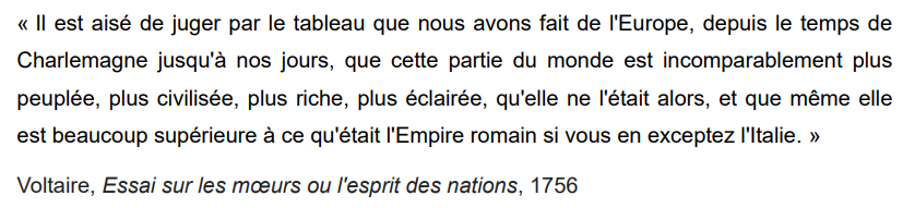 Pour le penseur de Ferney, c’est surtout depuis le XVIe siècle que l’Europe progresse : l’humanisme de la Renaissance, le développement de l’imprimerie et la multiplication des académies auraient permis le raffinement des mœurs et une meilleure application de la raison. 10/25