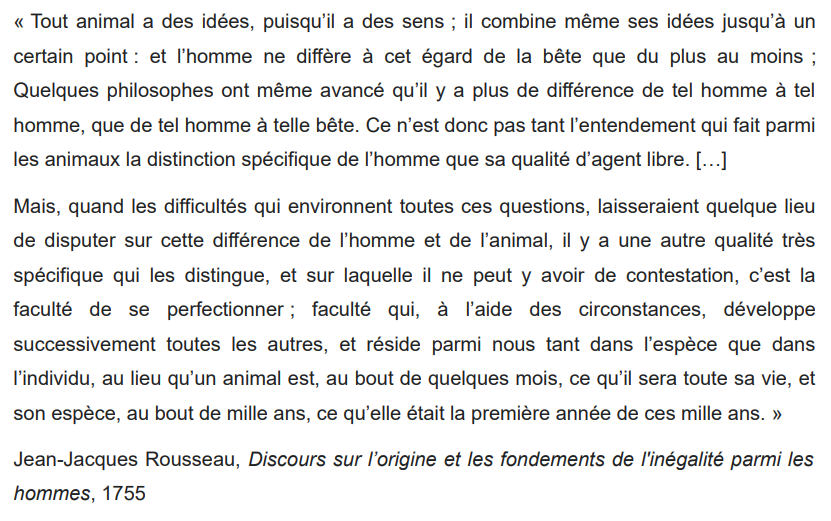 Dans son «Discours sur l’origine de l’inégalité», écrit en 1755, Rousseau soutient que l’humain possède «la faculté de se perfectionner», et donc de développer toutes ses autres facultés. C’est cette «qualité spécifique» (en tant qu’elle appartient à l’espèce humaine)… 20/25