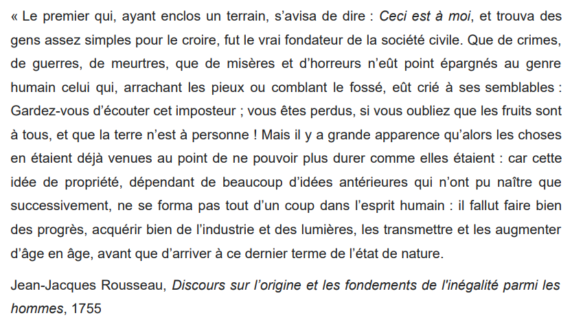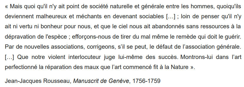 qui le sépare de l’état de nature, celui des bêtes et des sauvages sans moralité. Cependant, en se perfectionnant et en bâtissant la civilisation, il a aussi exacerbé la violence, les injustices et les vices. Même les arts et les sciences nuiraient in fine à sa condition. 21/25
