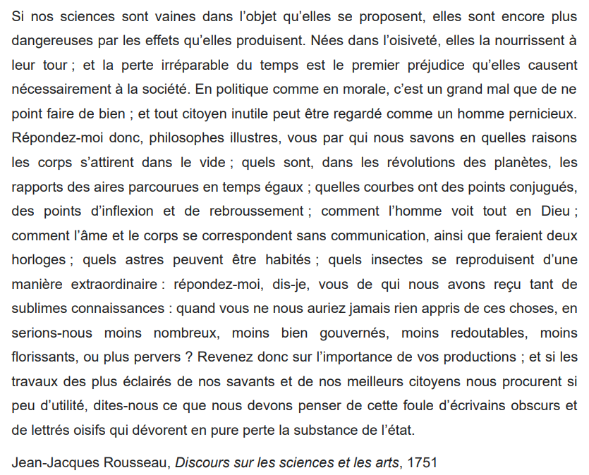 À ce point de notre réflexion, on pourrait croire que les philosophes des Lumières sont béatement progressistes. Cette croyance est fausse. Jean-Jacques Rousseau, notamment, a pensé le progrès et sa critique, la «perfectibilité» de l’homme et sa corruptibilité. 19/25