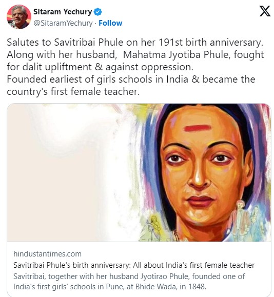 On 3rd Jan 2022, Communist Leader Sitaram Yechury post a Tweet on Savitribai Phule in which he acknowledged her role in dalit upliftment and he also called her country's first female teacher