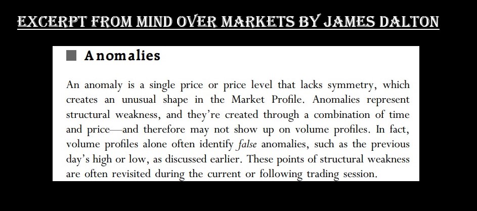Market profile anomalies are of significance because they are "asymmetric" structures within the profile caused by an unfinished auction leading to them being revisited often and can be leveraged by the informed trador.