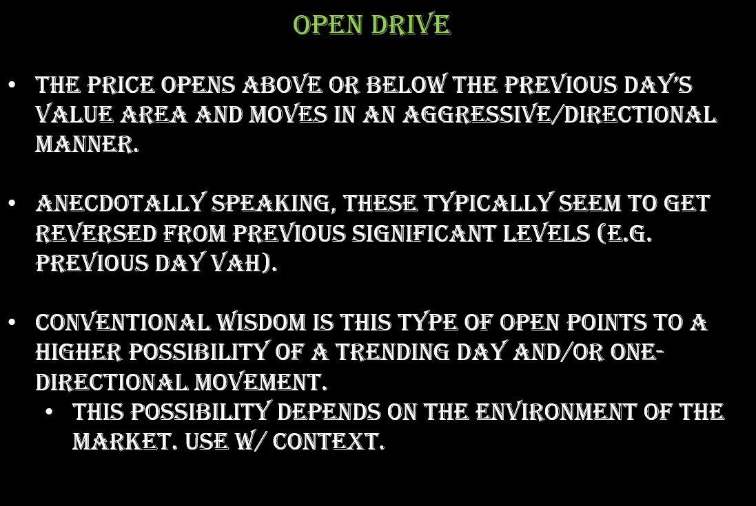 Price opens above or below the previous day’s value area and moves in an aggressive/directional manner.