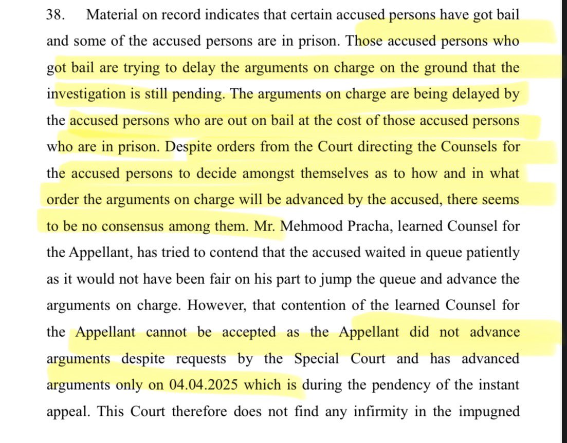 Para 38 from judgement today says EXACTLY what I had written. Those out on bail are delaying hearing at the cost of those in prison, so it can be argued that bail should be granted on because of “delay in trial”. This applies to ALL accused in the conspiracy case of Delhi Riots