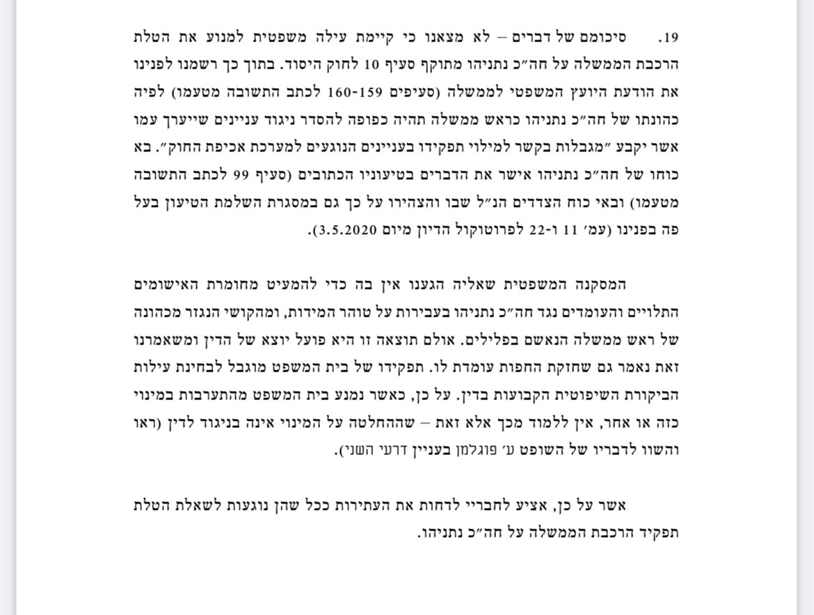 אבל, באותה נשימה בג"ץ "רשם לפניו" את הודעת היועמ"ש דאז, מנדלבליט, "לפיה כהונתו של נתניהו כראש ממשלה תהיה כפופה להסדר ניגוד עניינים שיערך עמו".