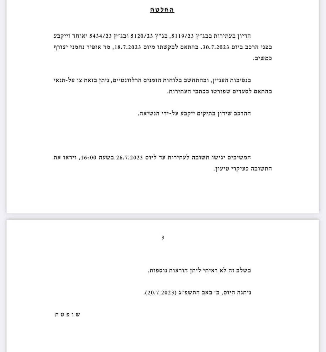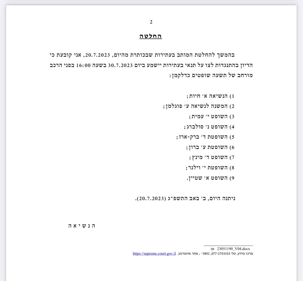 הדיון: יתקיים ביום 30.7, בפני הרכב מורחב של תשעה שופטים. ניתן צו על תנאי.