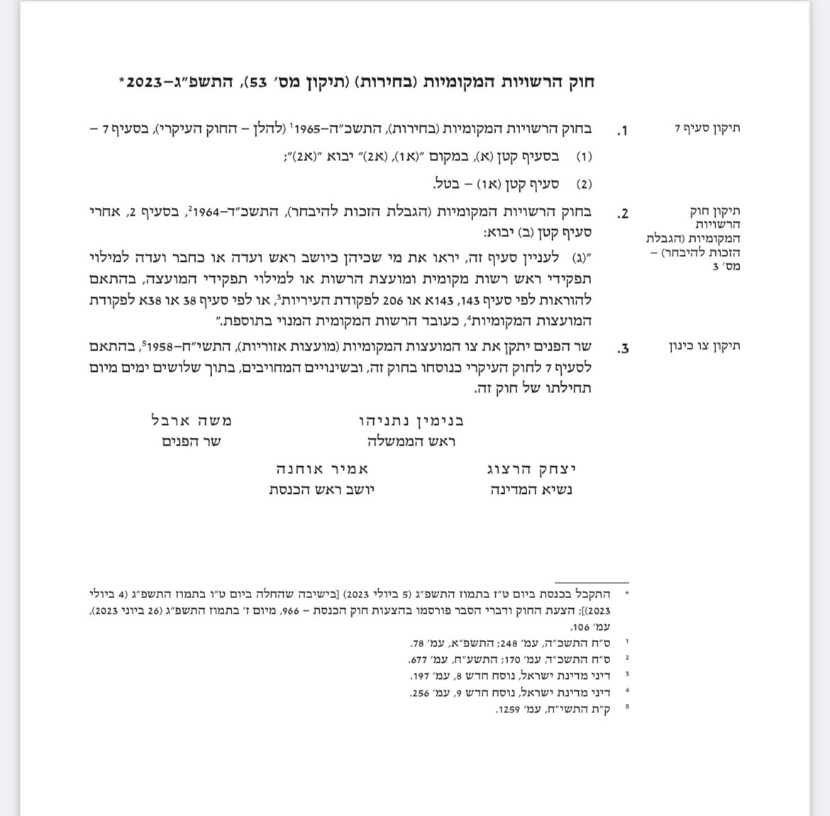 מהות: עתירה נגד חוקתיות חוק "רגיל" - תיקון לחוק הרשויות המקומיות (בחירות), אשר מאפשר ליושב ראש "ועדה קרואה" להתמודד בבחירות הקרובות, שיתקיימו ביום 31.10.2023.
