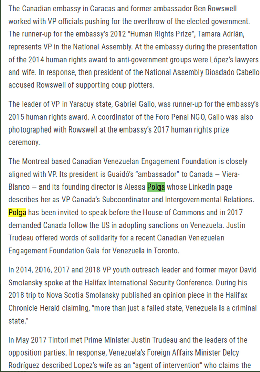 8 Polga is listed as the founding director of "Canadian Venezuela Engagement Foundation" located in Montreal, Que. Note the quote by D. Smolanksy "more than just a failed state Venezuela is a criminal state".