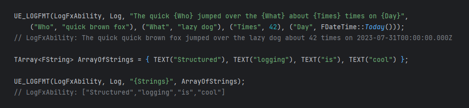 The new UE_LOGFMT macro is easier to use, allows for positional and named fields, and supports most basic types (booleans, integers, floats) + some core engine types (FString, TArray, FDateTime, etc.). Readable formatting strings are the new rage in 2023, I hear.