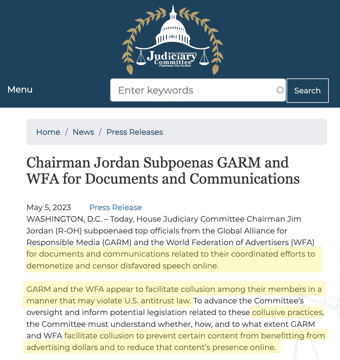 9/ Their criteria is anything but apolitical, and their friends over at GARM are now being subpoenaed by @Jim_Jordan’s Judiciary Committee for appearing to “facilitate collusion” in a way that “may violate U.S. antitrust law.”
