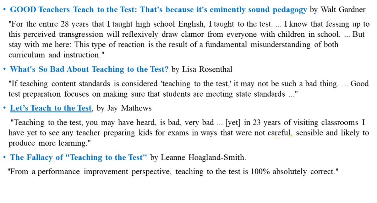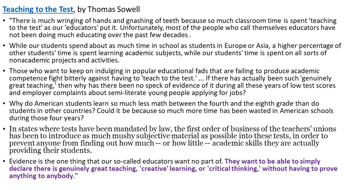 "..the first order of business of the teachers' unions has been to introduce as much mushy subjective material as possible into these tests, in order to prevent anyone from finding out how much -- or how little - - academic skills they are actually providing their students.