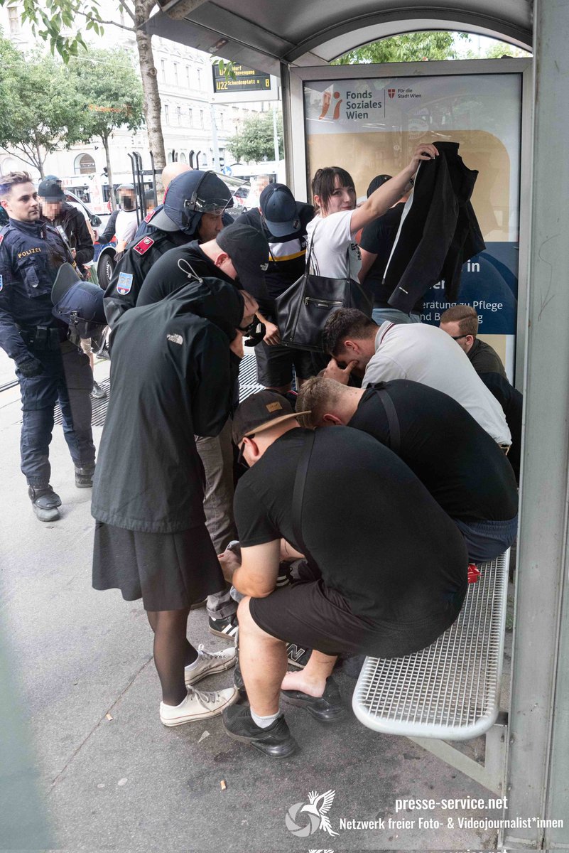 Der Großteil der Neonazis konnte - teils laufend, teils im Spaziertempo an der Polizei vorbei - entkommen. Etwa zehn Rechtsextreme wurden jedoch vor der Börse in einer Straßenbahn-Haltestelle von der Exekutive festgesetzt.