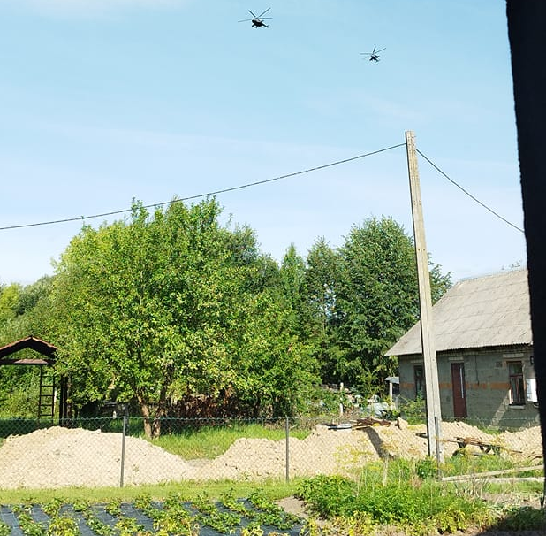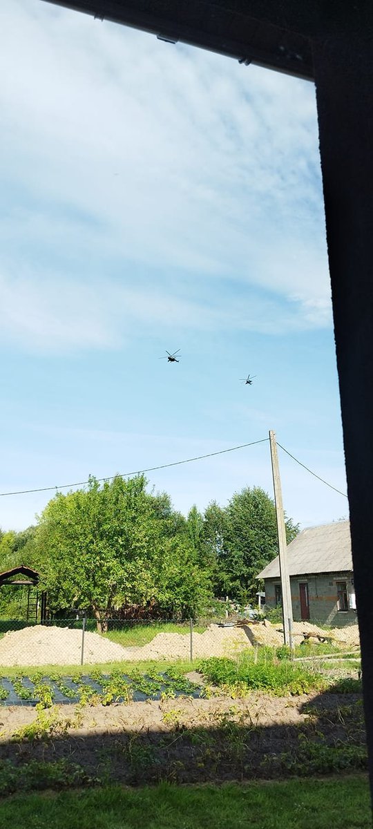 Zdjęcia wrzuciło już kilku mieszkańców Białowieży. Na wszystkich są te same dwa śmigłowce Mi-24 i Mi-8. Kolejna fotografia przelotu Białorusinów, Podolany Białowieża.