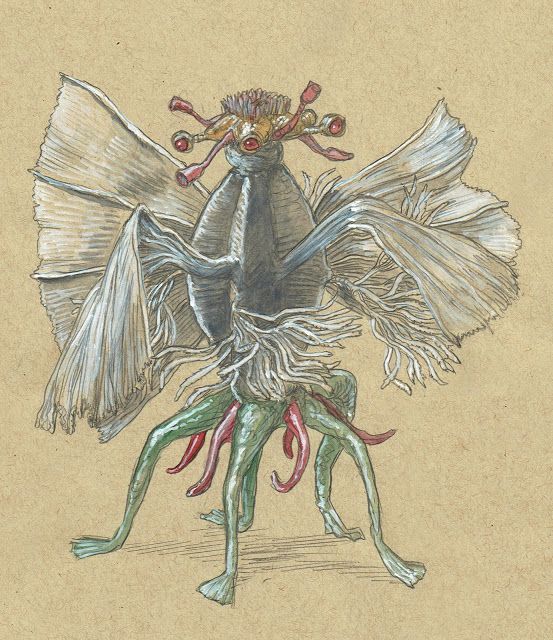 em sulcos entre as rugas, há apêndices curiosos — cristas ou asas que se dobram e desdobram como leques