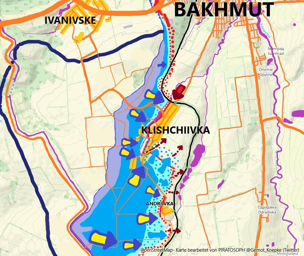 Südflanke,Im Raum Klishchiivka Andriivka wurden russische Gegenangriffe abgewiesen für die Russen verlustreich wird gemeldet. Die AFU setzt Streumunition ein und tritt zu eigenen Angriffen an. Kurdyumivka der Ort mit den heftigsten Kämpfen.