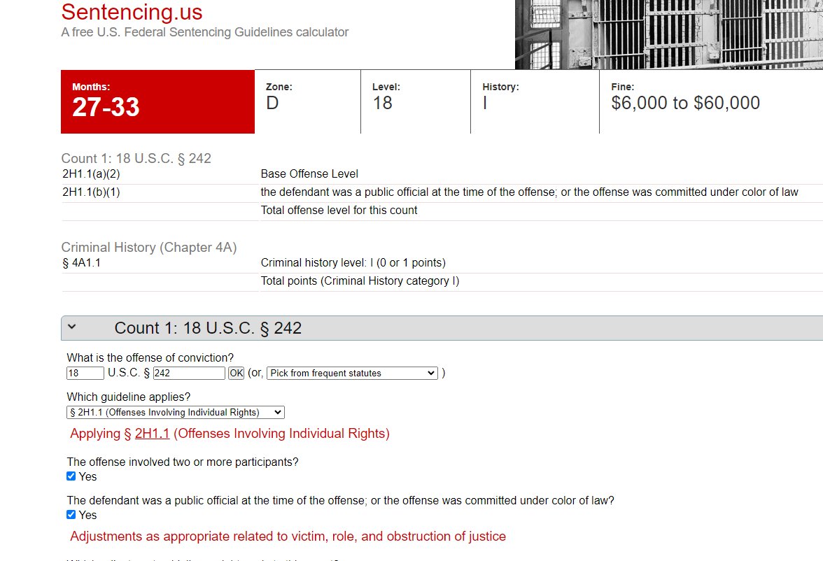 1. Not enough is being reported about the news that the charges against Trump may include a 18 USC 242 charge of Deprivation of Rights Under Color of Law. It's a big one. The guidelines show that this charge could be the one that puts Trump in prison. Possibly for life.