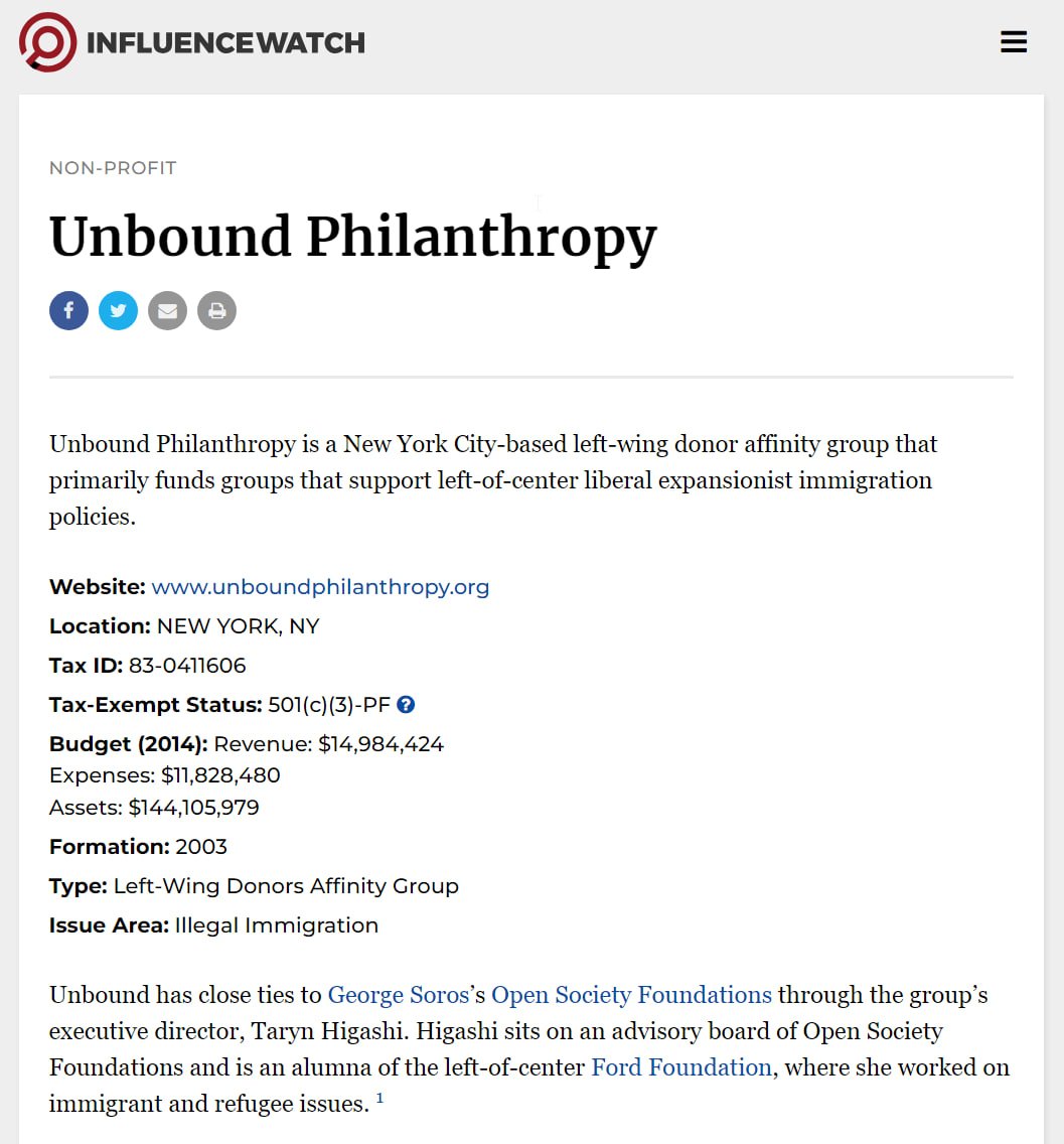 "Unbound Philanthropy is a New York City-based left-wing donor affinity group that primarily funds groups that support left-of-center liberal expansionist immigration policies.