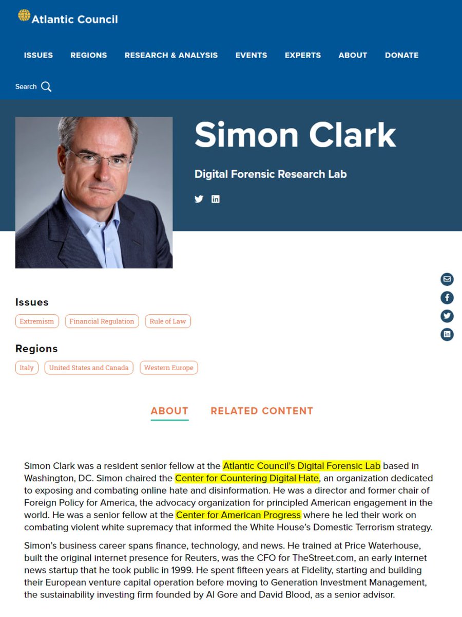 Simon Clark is the Chairman of CCDH's Board, a member of the Atlantic Council's Digital Forensic Lab, and a senior fellow at John Podesta's Center for American Progress.