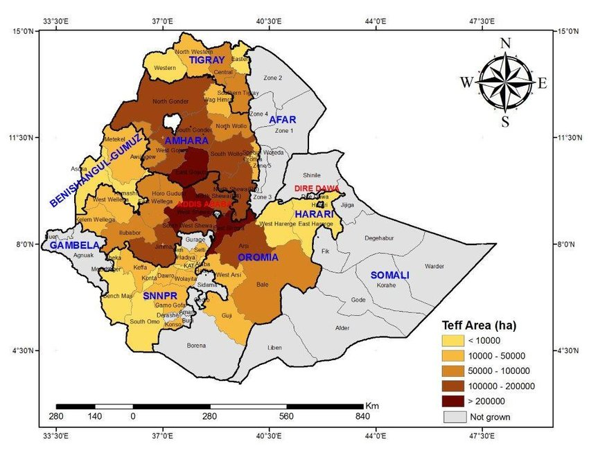 T’ef, taxonomic name Eragrostis tef, is an orphan crop (little international trade and no organised efforts for variety improvement) cultivated especially in Ethiopia and Eritrea, covering (as of 2015) 3 million hectares of land, owned by over 6 million small-scale farmers