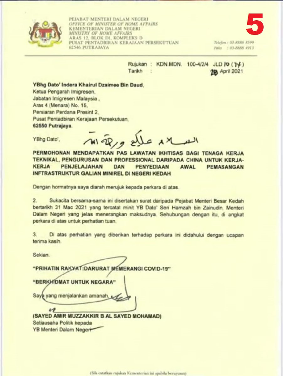 Kemudian gambar 5, surat dari Setiausaha Politik Hamzah, hantar kepada Ketua Pengarah Imigresen.