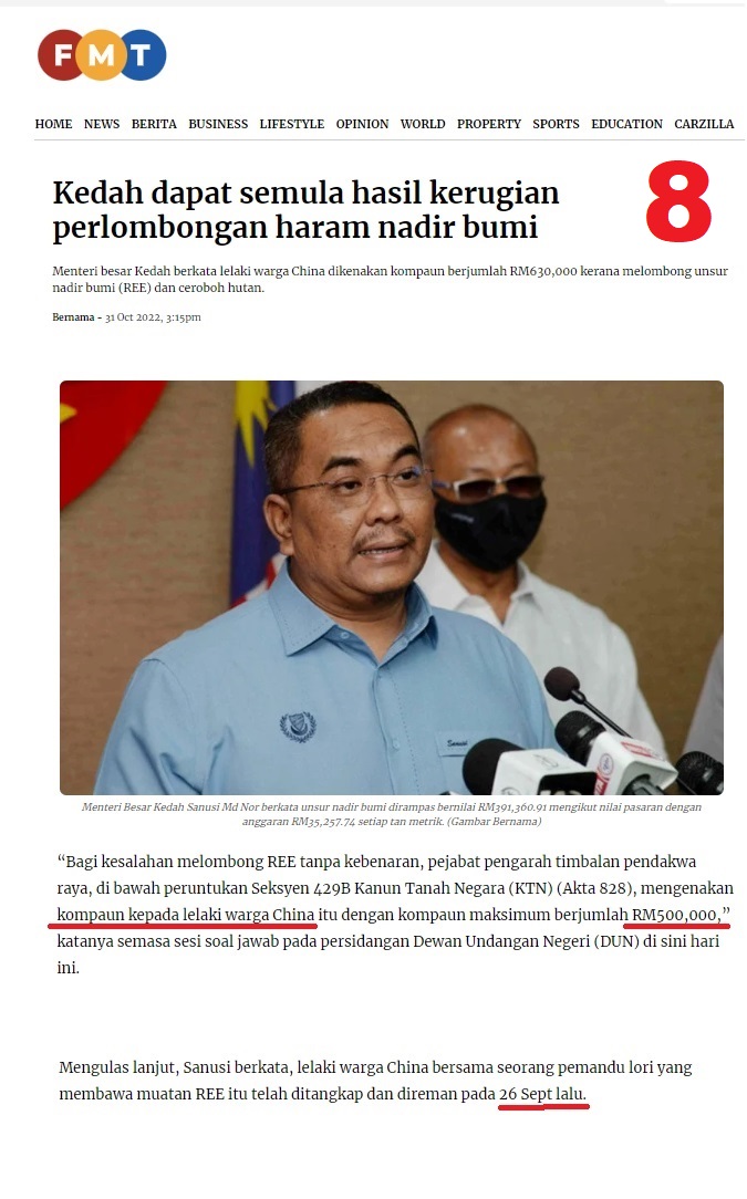 Okeh, ni membawa cerita ke gambar 8. Berita tu tulis, kesalahan melombong REE tanpa kebenaran. Seorang lelaki warga China dikenakan kompaun maksimum RM500,000 di bawah seksyen 429B Kanun Tanah Negara.