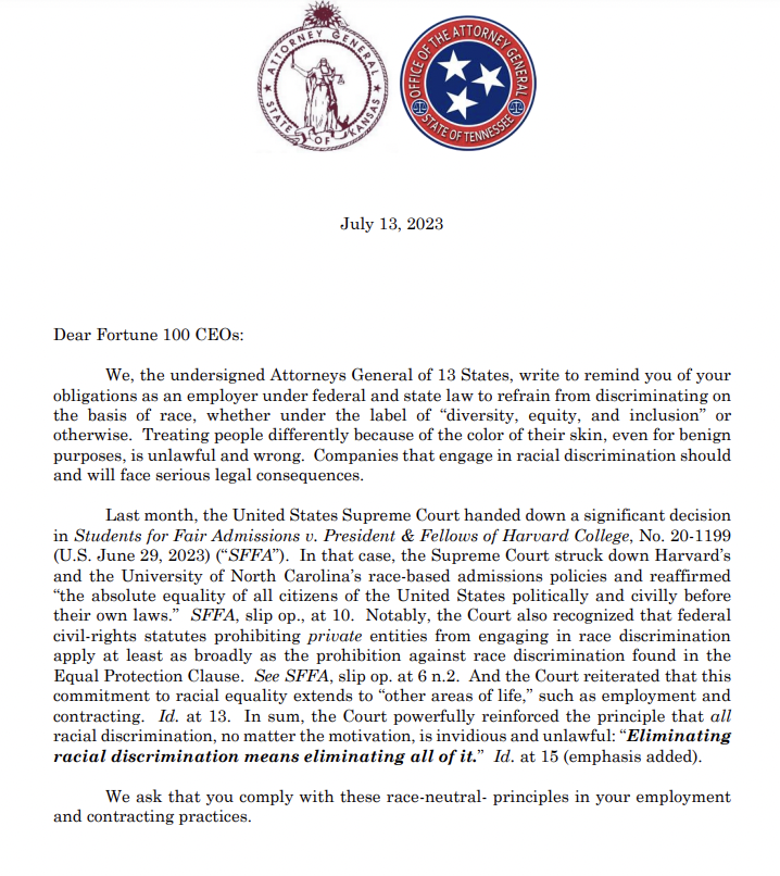 1. 13 GOP Attorneys General wrote a letter to 100 top CEOs alleging they were discriminating against white people — "an inversion of the odious discriminatory practices of the distant past."